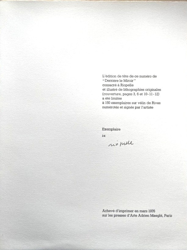 Édition de tête dite « deluxe » limitée à 150 exemplaires sur vélin de Rives. Ici l’exemplaire 34/150, signé au crayon plomb par Riopelle sur la page justificative.