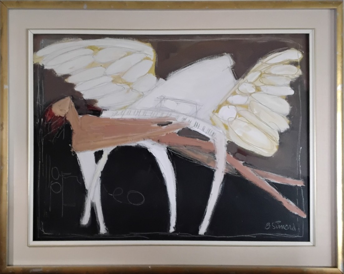 Cette peinture n'a probablement jamais circulé, mais elle représente Ste-Cécile, patronne des musiciens au piano.