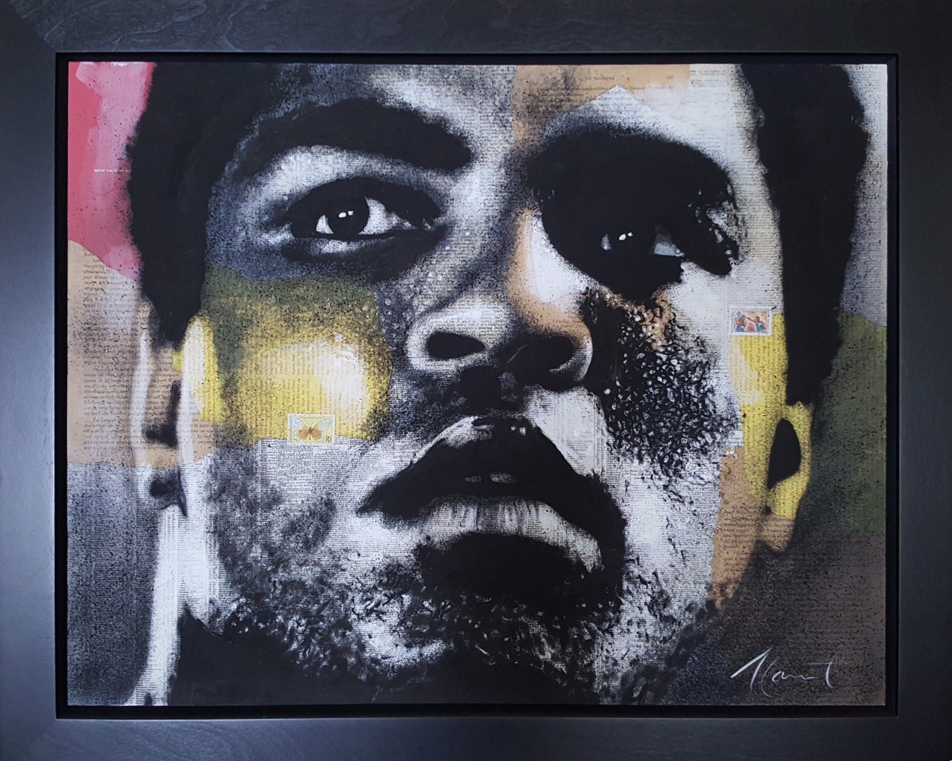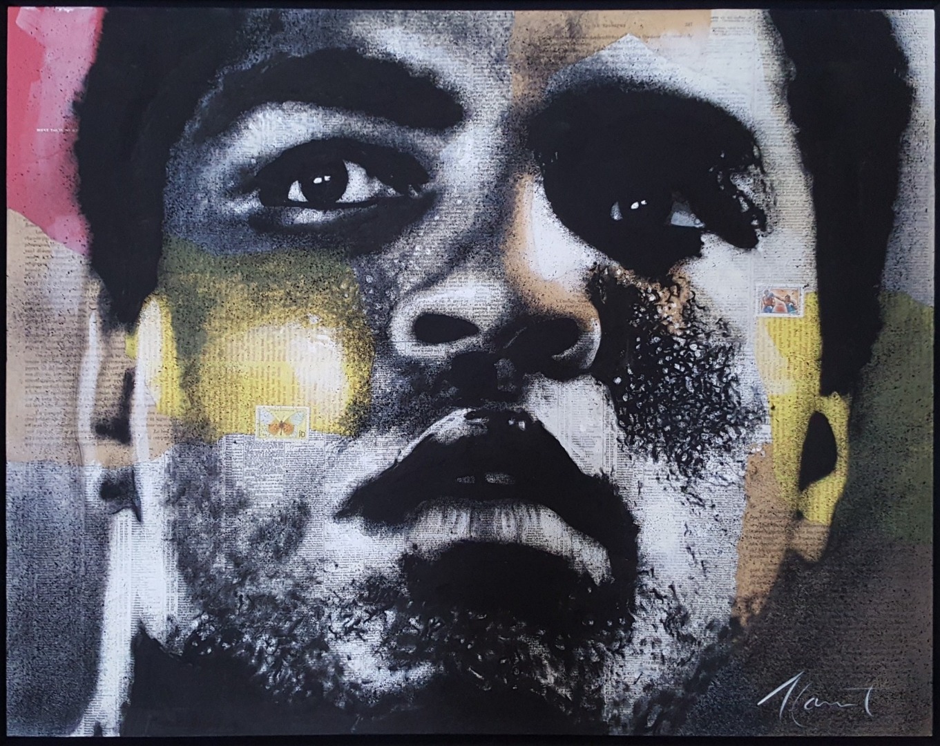 Monet insère des références à ses œuvres selon le sujet. Ici, pour Ali, on observe la tache rouge, en haut à gauche, qui rappelle les commotions cérébrales; à 2 autres endroits : un timbre poste qui avait été édité pour le célèbre combat à Kinshasa et un autre timbre poste avec un papillon qui réfère à sa célèbre phrase : "Float like a butterfly, sting like a bee" il y a déjà 60 ans. Génial !