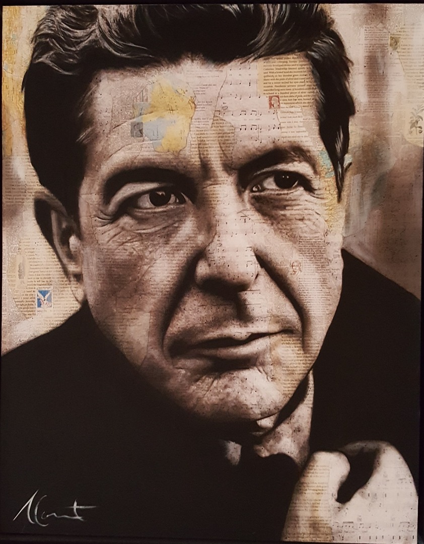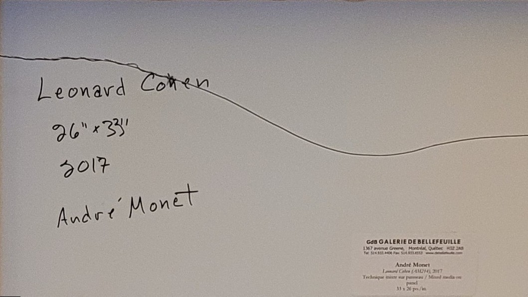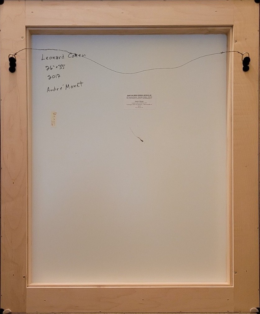 Dans ce tableau, Monet insère des références sur Cohen: des fragments de partition de ses principales chansons et de cartes géographiques des lieux où il a vécu.